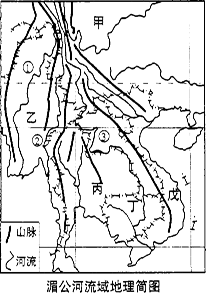 (4)流域内各国具有各自的地理优势,易于形成互补。图中甲、乙、丙、丁、戊代表的国家中,水能资最丰富国家的代码是__________,世界重要的橡胶生产国和出口国的代码是_________,世界稻米出口量最大国家的代码是________。
