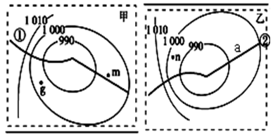 本题解析:从图中可以看出,甲、乙两幅图表示的都是气旋,由题意可知,甲是南北球,乙是北半球,所以①是向东北方向移动,所以A错误;乙天气系统是气旋,气旋系统中心气流是辐合上升的,B也错误;甲天气系统东侧盛行偏南风,而且形成暖锋;m地受偏南风的影响,有降水,n地在锋后,也是晴朗天气,故选C.