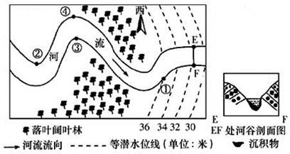 【小题2】A项,根据EF的河床剖面分析,河流自南向北流,水流多向东岸冲刷,即地转偏向力向右偏,为北半球;A项错误。B项根据当地的植被为温带落叶阔叶林判断位于温带,且为北半球大陆东岸,故河流有冰期,且河流方向为向南向北流,即由较低纬流向较高纬,故判断可能有凌汛,B项正确。