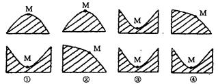 (3)下面四组图分别是沿两个相互垂直的方向所作的地形剖面图。请分析M点在①②③④四图中的地形类型:
