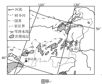 (3)指出图甲中甲地的植被状况,并推测甲地煤炭资源形成时期的地理环境。(8分)