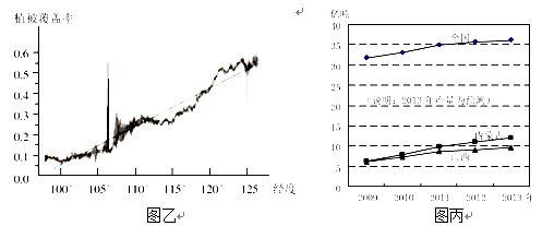 图乙为内蒙古自治区不同经度的植被(包括森林、草原和农作物)覆盖率的变化图丙为 2009—2013 年内蒙古、山西和全国煤炭产量统计。