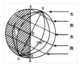 3、综合题 该图为“地球某日太阳光照示意图”,图中阴影部分为黑夜,其他地区为白昼,读图完成下列问题。(20分)