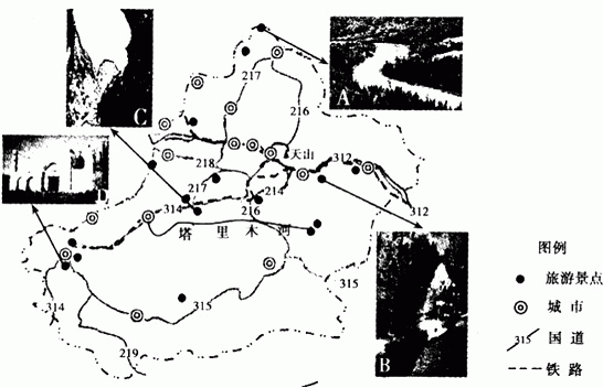2、综合题 下图为新疆部分旅游景点分布图,读图完成下列问题。
