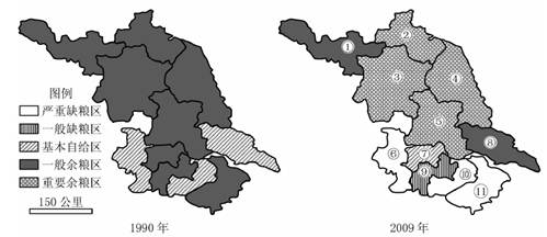 4、单选题 下图示意我国某省1990~2009年人均粮食地域格局变化。读下图,完成小题。