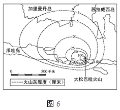 5、单选题 图6表示1816年印度尼西亚大松巴哇火山爆发后火山灰厚度的分布 。读图回答22~24题。