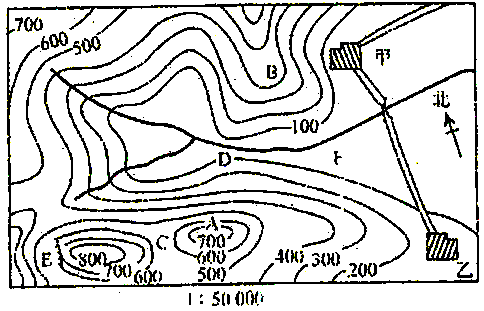 (5)丁处(1分)。原因:丁处附近等高线密集,(1分)该处的山体坡度较陡(1分),发生滑坡的可能性大。
