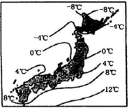 小题1:图示0°C等温线穿过日本中部,判断为冬季。