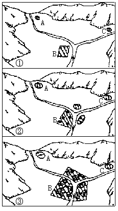 (2)B城市由①→②→③的历史演变反映了一种?过程,该过程中城市变化的特点是:?。