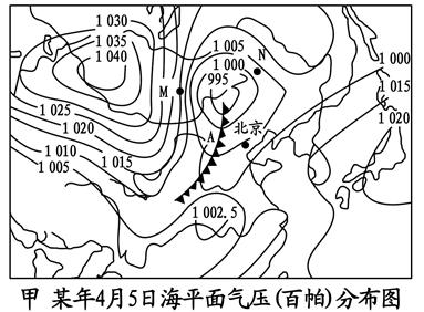 (2)图甲中A天气系统类型为________,其到达北京时的天气状况是________________________900、925、950百帕四条等压线,并判断该图所示天气系统的类型。