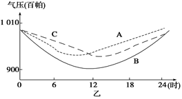 5、综合题  某灾害性天气系统从珠江口附近过境,如图甲所示:A、B、C三地观测到过境时的气压与平均风速随时间的变化规律示意图分别如图乙、图丙所示。回答下列问题。(12分)