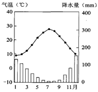 5、单选题 下图为某地气温曲线和降水柱状图,读图回答1—2题。