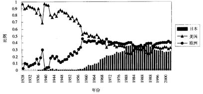 参考答案:(1)美国汽车比例呈现下降趋势,欧洲和日本汽车比例呈上升趋势,60年代后基本稳定且三地区比例大致相当。