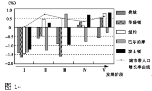 本题解析:本组题一方面考查了学生对地理基本概念城市化、逆城市化的理解,另一方面考查学生的读图能力,获取和解读地理信息的能力,难度较大。从图中可以看出:Ⅰ阶段,各大城市中心城区人口增长率都小于0,说明出现逆城市化,A对;Ⅱ阶段到Ⅲ阶段,波士顿的中心城区人口增长率由正变负,而且中心城区人口增长率低于中心城区人口负增长率,B错;费城中心城区的人口负增长状况没有得到有效抑制,C错;Ⅵ到Ⅴ阶段,巴尔的摩市的中心城区人口一直为负增长,D错,所以(1)答案为A。结合该区城市化的变化过程,(2)答案为B。