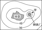 PM2.5浓度主要是受工业排放的废气和汽车尾气的影响,甲地西南部有一个钢铁厂,若PM2.5观测到最高值,则是受钢铁厂的影响,此时吹的风向是西南风。