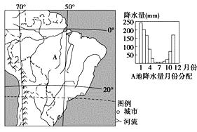 (1)根据图示信息可以看出A地处巴西高原,该地属于赤道低气压带和东南信风带交替控制形成的热带草原气候区,夏半年(11月~次年4月)受赤道低压南移影响,降水多,冬半年(5月~10月)东南信风控制,降水较少,所以降水突出特征是降水干湿季明显,季节变化大,夏半年11月~次年4月,降水多,冬半年5月~10月,降水少。