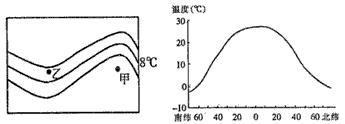 3、多选题 ? 下图左为“某海域表层海水等温线分布示意图”,甲、乙两处分别位于大洋的东、西两侧。下图右为“海水表层温度随纬度的变化图”。读图完成1—2题。