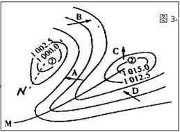 2、单选题  下图是我国局部地区某月地面天气形势图,读图回答下列问题。(共10分)