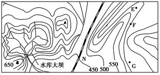 本题解析:连接E、N两点,可知连线经过山脊,故两点不能通视;铁路经过陡坡和陡崖附近,沿线易发生滑坡和泥石流;根据该图等高线分布可知,E、F、G的海拔在600米以上、700米以下;水库坝底海拔450~500米,坝顶海拔550米,故坝高在100米以下。
