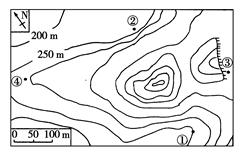 1.甲组队员准备在图示地区宿营,为避免突发的山洪,你认为在①②④三地中,最不适宜宿营的地点是2.若乙组队员已经宿营在图中最高处,为了可以互相观测到对方,从安全角度考虑,甲组应把宿营地选择在图示四地中的