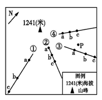 2、单选题 如图中,①、②、③、④表示某区域地形类型中的山脊或山谷,点a、b、c对应的海拔分别为900米、600米、300米。读图,回答下列小题。