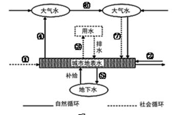 5、单选题 有专家提出水循环可分为自然循环和社会循环两大类,图为“某城市水循环示意图”,读图完成下题。