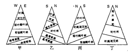 A.内蒙古高原、华北平原 B.塔里木盆地、长江中下游平原 C.青藏高原、云贵高原 D.云贵高原、黄土高原 3、单选题 图为“四地山地植被垂直分布示意图”,甲地位于南半球,其余均位于我国。读图回答题。 |