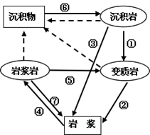 2、单选题 如图,岩石物质循环模型说明岩石通过不同的过程可以从一种形态转化成为另一种形态。回答下面各小题。
