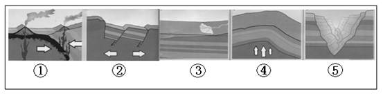 3、单选题 下图为“科罗拉多大峡谷成因示意图”,①~⑤表示了它的形成过程。读图完成下列各题。