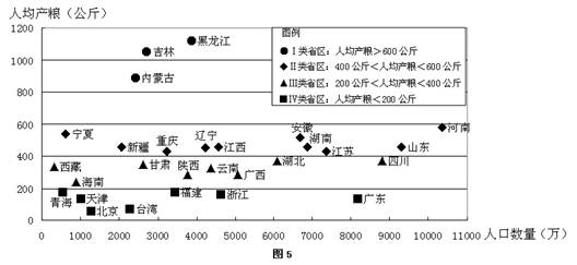 4、单选题  读2008年我国部分省区人均产粮和人口数量坐标图(图5),完成问题。