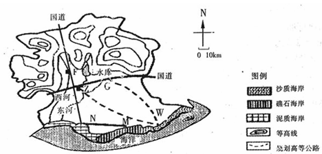 小题2:W处为沙质海岸,沙软潮平,水质清澈,不利于建港口,而适宜发展旅游业,故不适宜建焦化厂和电厂等污染企业,A错误。该地区的陆上交通运输只有公路,而不适宜钢铁工业的大量运输,B错误。N地附近有大面积盐田,故适宜建盐化学工业基地,C正确。F位于河流上游,污水处理厂应布局于河流下游,D错误。