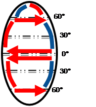 规律一:以副热带为中心的中低纬度海区:反气旋型大洋环流(北顺南逆)。