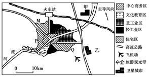 (3)拟在甲、乙两处规划建设高新技术工业城和石油化工城两座卫星城市。石油化工城应建在 处,理由是___________________________________________________________