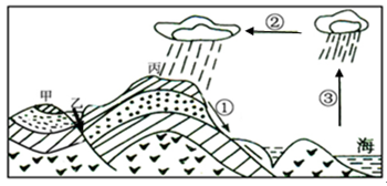 (1)写出图中甲、乙、丙的地质构造类型:(6分)
