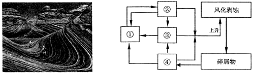 【小题1】图右为岩石圈物质循环示意图,上述波浪岩与图中数字表示的岩石类型一致的是( )