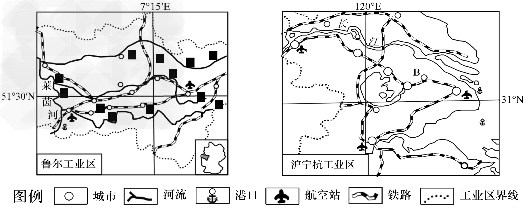 材料一:鲁尔工业区和沪宁杭工业区的局部区域图