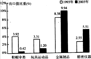 材料二:下图为“台湾1993年和2003年部分出口产品所占比重统计图”