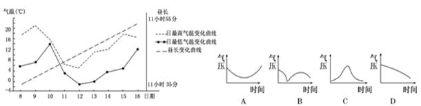 4、单选题 下图是济南市某时段气温和昼长变化示意图。读图后判断能正确反映济南市该时段气压变化的是