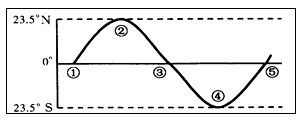 A.① B.② C.③ D.④ 参考答案: 本题解析: 本题难度:一般 2、单选题  该图是太阳直射点在地球表面移动示意图。在我们祖国60周年庆贺日,太阳直射点在哪个区域并向哪个方向移动?(?) 参考答案:C 本题解析:图示②表示太阳直射点位于北回归线上,为北半球夏至日;④表示太阳直射点位于南回归线上,为北半球冬至日;则①表示春分日;③表示秋分日;⑤表示春分日。我国的国庆节为10月1日,位于9月23日—12月22日之间,故位于③④之间,并向南移。 本题难度:一般 3、单选题  读二分二至图,完成小题。 |