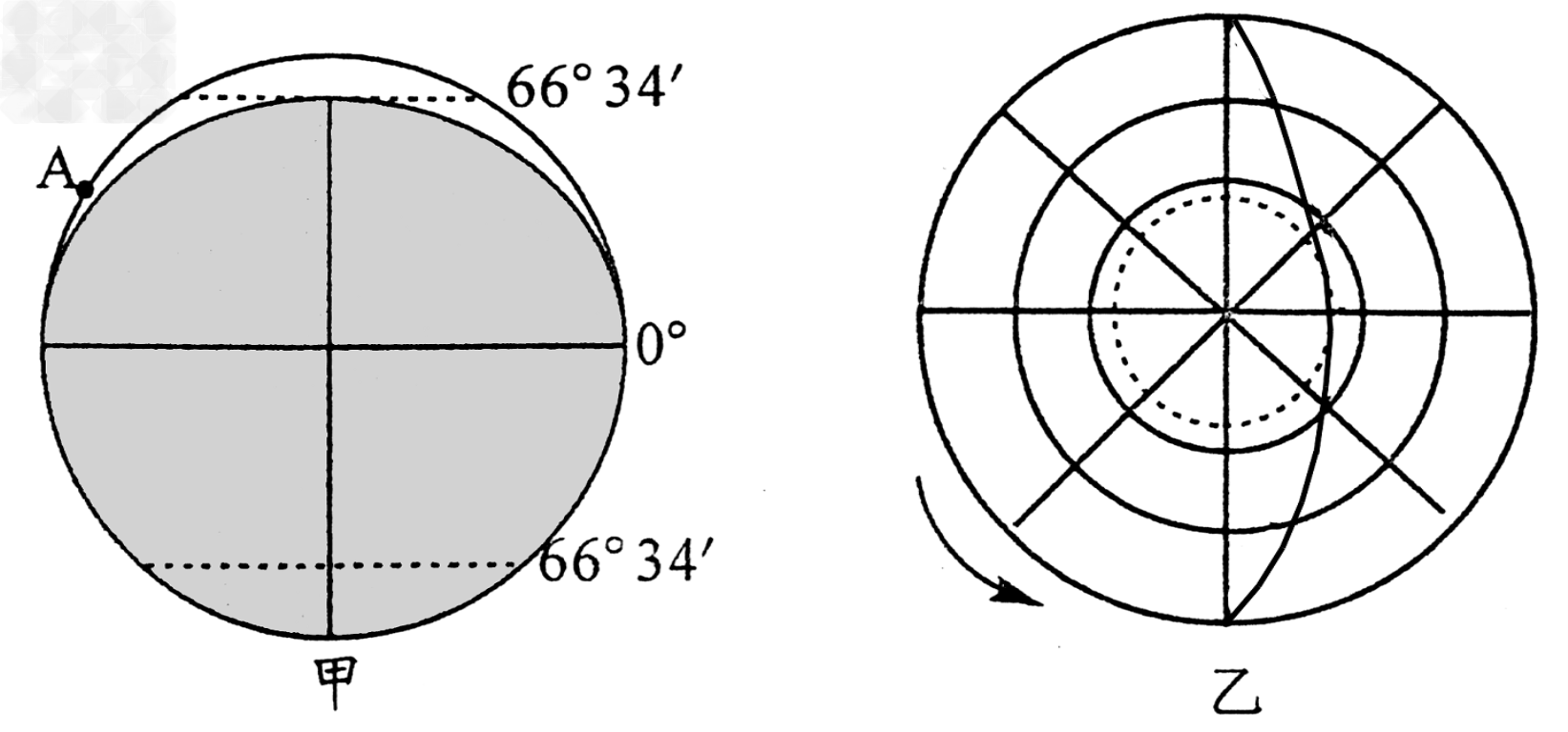 5、综合题 地球的平均半径为6371千米。甲图中阴影部分为黑夜,乙图是甲图的极点俯视图。此时北京时间为9时。读图,回答问题。
