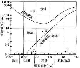 【小题1】图中两条曲线之间的为搬运状态,当河流流速低于沉降速度时,颗粒物可以在河床中堆积。依题意,在横坐标0.1处作垂线与沉降速度线相交,过该交点作水平线与河流流速轴相交,此点速度即是答案,故C项正确。