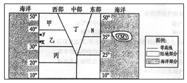 C.乙区域同属一种气候类型,但x、y降水有差异,降水较多的地点是x