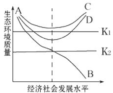 单选题 生态城市建设是促进我国城市可持续发展的必然选择。图8表示生态城市建设面临的三条道路。其中K1表示生态环境质量安全警戒线,K2表示生态环境质量恶化警戒线。读图回答问题。