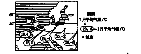 2.读图,根据图中的平均气温值可以判断,西部属于温带海洋性气候,东部冬冷夏热,最冷月气温小于0度,气温年较差大,属于温带大陆性气候。A错。伦敦冬季气温高是沿岸有北大西洋暖流经过,受北大西洋暖流影响大,B对。自西向东年降水量递减,大陆性增强,C错。自西向东气温年较差增大,大陆性增强,D错。