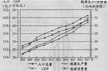 本题解析:1.据图分析:2008—2017 年人口总数增加,能源消费量也增加,此图不能反映人来源:91考试 网均能耗的变化;根据图中人口总数的变化趋势,人口增长的速度放缓;万亿元GDP增长斜率大于能源消费量增长斜率,所以万元GDP能耗呈下降趋势;能源消费量大于能源生产量。所以本题选择CD选项。