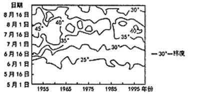 单选题 夏季风前沿决定着我国锋面雨带的位置,其风力的强弱、推进位置及停留时间,直接影响我国东部地区的降水和水旱灾害。如图示意我国110°E—120°E夏季风前沿纬度位置的进退过程。读图完成下题。