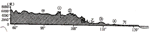 1.图中山脉①②③④中,属于我国地势二三级分界线是2.甲地区丰富的新能源是3.乙地区发生农业生产的有利气候条件是