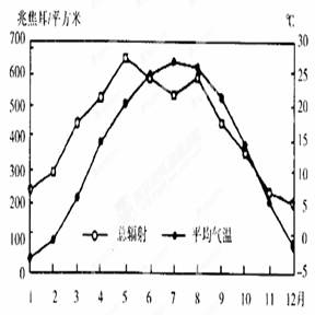 单选题 下图为我国某城市月平均气温及月平均总辐射曲线图。读图回答下列问题。