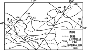 1.结合图例和图中的经纬网可以看出该区年降水量自东南向西北依次递减1月份气温自北向南递增甲、乙两地的年降水量都在200~400毫米之间植被类型都为草原。