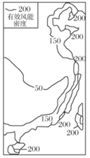单选题 图为“我国沿海地区有效风能密度分布图”,读图完成下题。